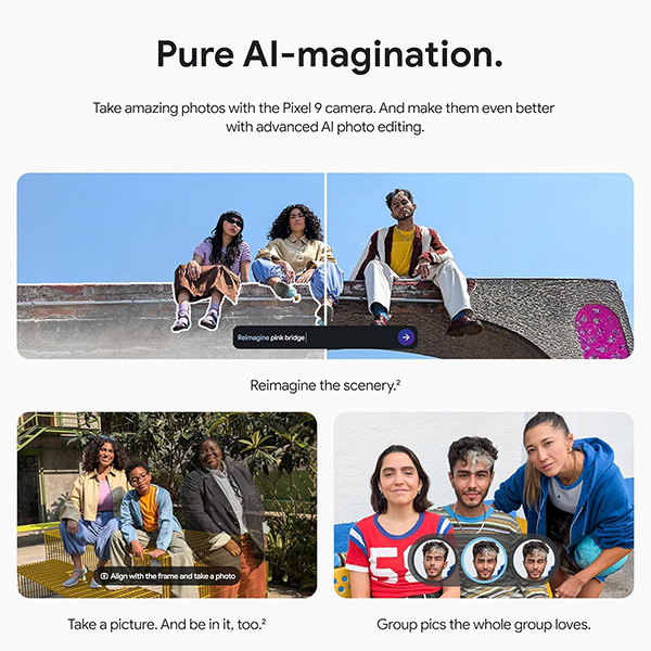 Meet Pixel 9 with Gemini. Engineered by Google, Pixel gets the best of Google AI first. So you can take amazing photos, make edits like magic, and get things done even easier. Pixel can protect against spam and other threats, and it helps you in an emergency.[9]